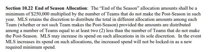 Read carefully. MLS can split that money however it wants, whether a team missed or made the post-season. Just as long as the teams that the allocation is split to are equal to at least two fewer than the number of teams that make the postseason. So in our example, as long as MLS splits this amongst at least 10 teams, they can do whatever they want with the money.